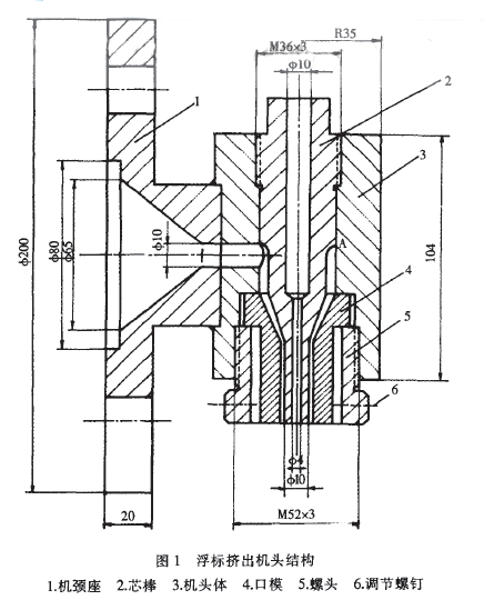 (1) The neck seat (piece 1) is flanged to the extruder barrel, and the inner cavity port is used for placing a stainless steel perforated plate to change the molten material from a rotary motion to a linear motion, and also to prevent impurities and unplasticized. The material passes. The central portion of the inner cavity is designed to have a compression angle of 30. ~45. The bell mouth is used to generate the necessary molding pressure to increase the flow rate of the fabric flow. The neck seat and the head body (item 3) are connected by multi-point welding.